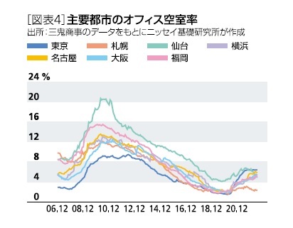 とはいえ、市場としてはまだまだ調整局面が続いています。オフィス仲介大手三鬼商事やニッセイ研究所のデータによると、2022年6月の東京都心5区の空室率は6.39%(前月比+0.02%)、平均募集賃料(月坪)は23ヶ月連続下落の20,273円となっています。他の主要都市については、新規供給の少ない札幌と仙台の空室率が低下する一方、横浜や名古屋、大阪、福岡の空室率は上昇基調にあります。また、募集賃料は仙台を除いて前年比プラスを確保しています。