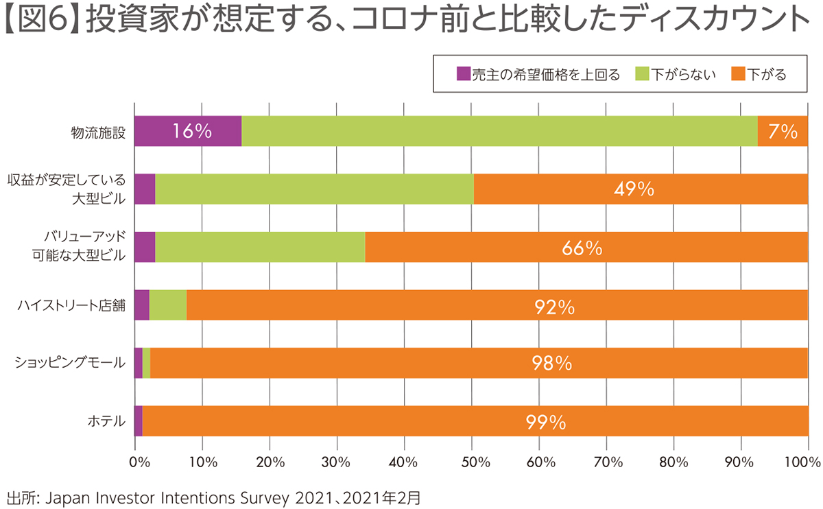 アセットタイプ別の価格水準は、物流施設において投資家の16%が「売主の希望価格を上回る」と回答し、「コロナ前と比べて下がらない」も77%に上っています。一方、「下がる」と回答した投資家は、オフィスが49%(収益が安定している大型ビル)と66%(バリューアッド可能な大型ビル)を占め、商業施設とホテルに至っては9割を超えました。