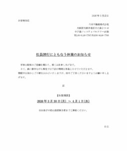 平素は格別のお引き立てを賜り、誠にありがとうございます。 さて、誠に勝手ながら弊社では下記の期間を休業とさせていただきます。 期間中は何かとご不便をおかけいたしますが、何卒ご了承くださいますようお願い申し上げます。
